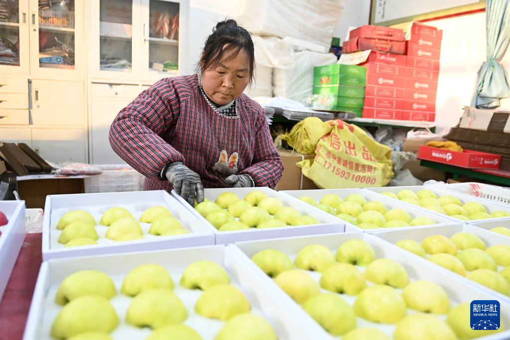 1月9日,在陕西省渭南市白水县秋林苹果专业合作社,工人打包装箱“瑞雪”苹果。新华社记者 李一博 摄