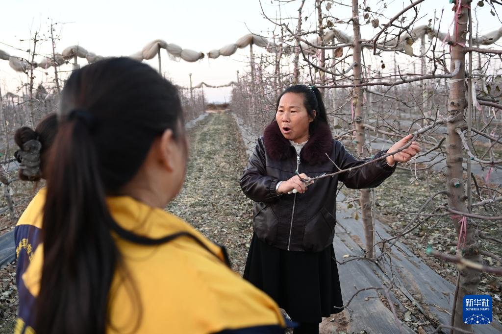 1月9日,在陕西省渭南市白水县秋林苹果专业合作社的果园里,合作社理事长林秋芳(右)讲授苹果枝修剪要点。新华社记者 李一博 摄