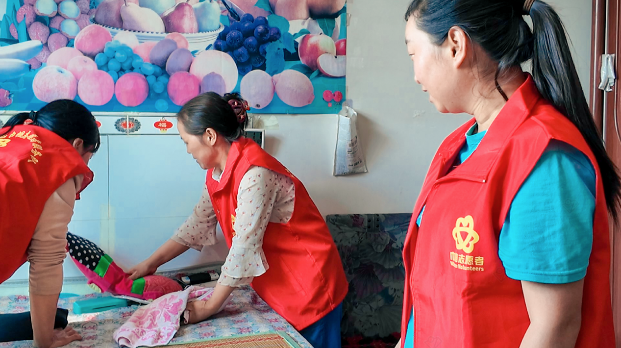 在黄陵县阿党镇葡萄寨村,妇联巾帼志愿者服务队帮助群众料理家务。该村通过志愿服务与文明实践活动涵养乡风文明,获评省级 “千万工程” 示范村。