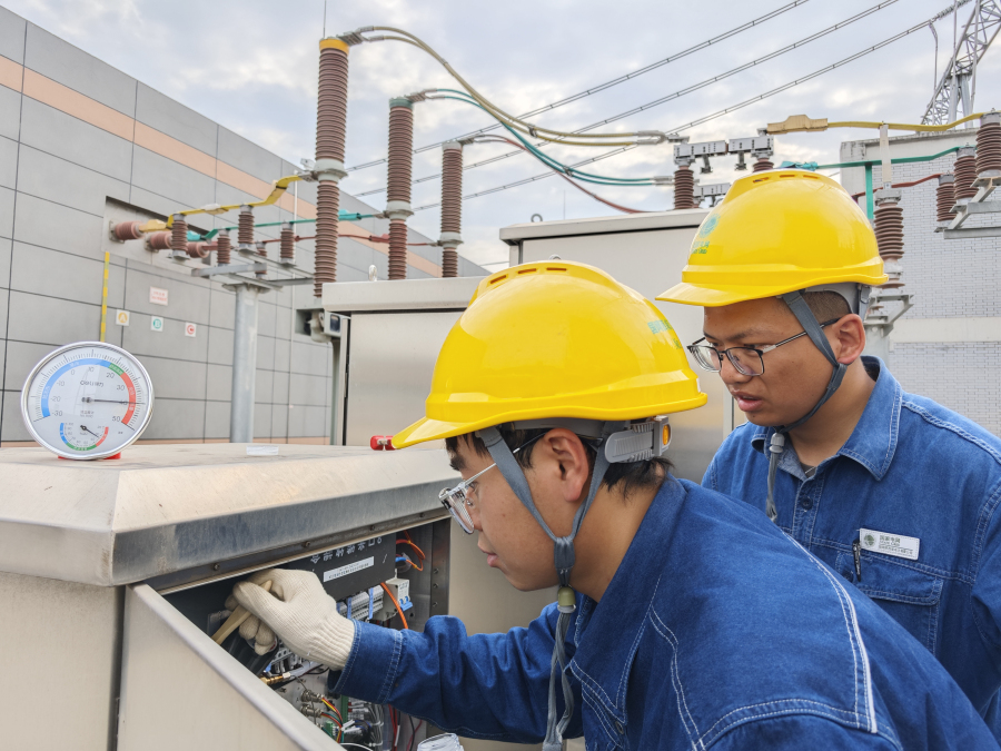 国网西咸新区供电公司变电运维人员在330千伏澎王变电站进行设备清扫。