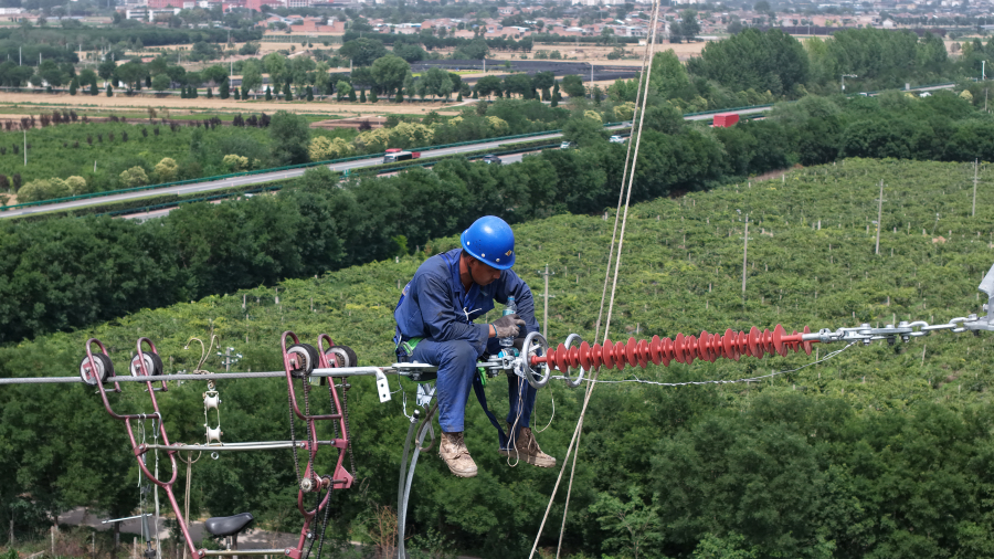 国网咸阳供电公司工作人员在110千伏后稷至大庄(小寨)线路送出工程施工现场开展架线作业。