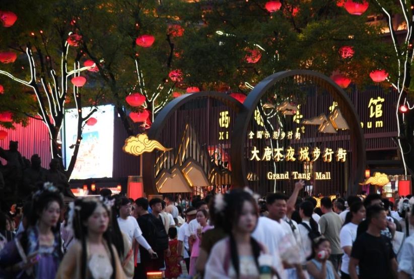 西安大唐不夜城步行街秉承“文化+”發(fā)展理念,逐漸形成了以開元盛世等五大文化主題雕塑群為主線,以各類音樂表演、行為藝術(shù)等文化精品為亮點,以商業(yè)綜合體、非遺展示、網(wǎng)紅文創(chuàng)、休閑餐飲等業(yè)態(tài)環(huán)繞的街區(qū)布局,釋放了文旅休閑消費潛力。