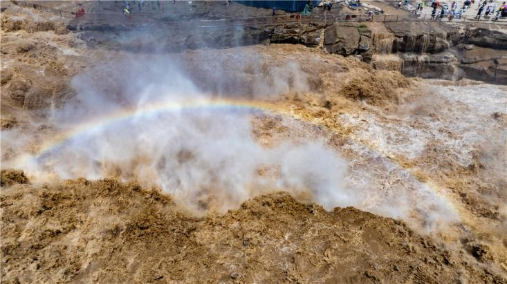 從空中俯瞰,奔騰的河水呼嘯而下,主副瀑布攜手傾瀉,出現(xiàn)“水岸齊平”、“金濤拍岸”的壯美景觀,正式進(jìn)入今年最佳觀賞期。