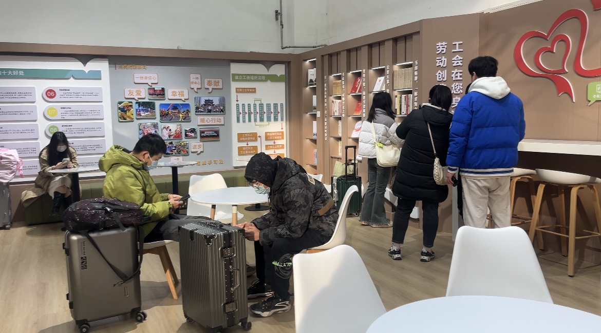 "春運(yùn)首日,火車站24小時(shí)工會驛站的成立,將全天候?yàn)槁每吞峁┬畔⒆稍?、緊急救助、閱讀小憩等一系列貼心服務(wù),讓旅客熱可納涼、冷可取暖、累能歇腳、渴有茶飲,為廣大旅客提供了一個(gè)溫馨、便捷的休息與服務(wù)場所。"